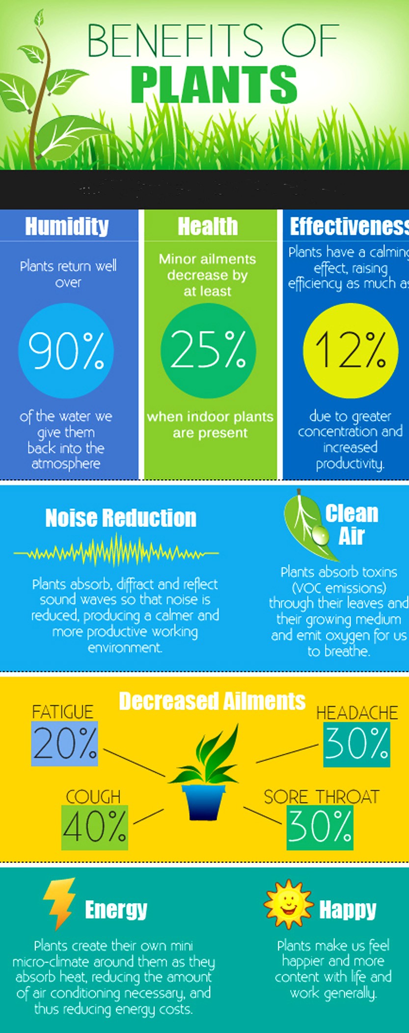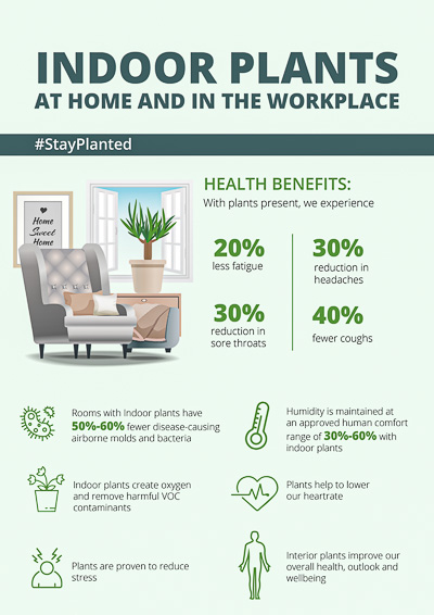 Plants make us feel better! Data has shown that our blood pressure lowers and our stress level, as measured by skin conductivity, decreases. We have fewer sore throats and headaches, and absenteeism goes down in workplaces with plants.