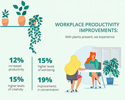 Plants help us perform better! Studies have quantified performance on computer tasks, concentration, and memory improve, and collaboration is enhanced. Plants give our eyes and minds a rest from the screens which we are staring much of the day.
