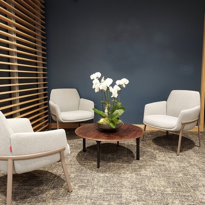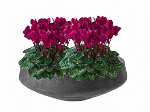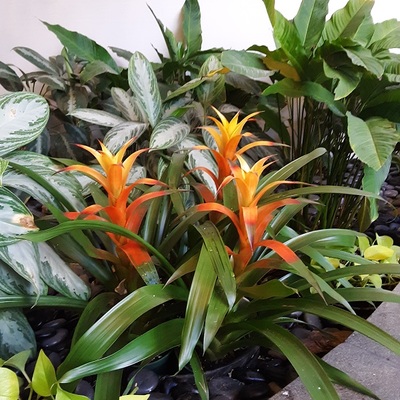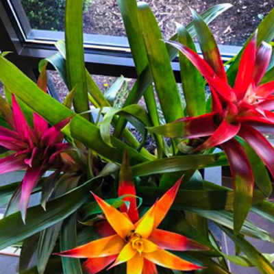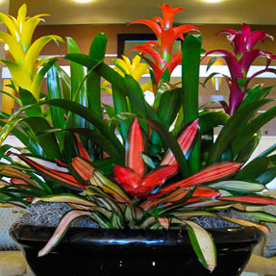 All colors of the rainbow are possible with rotations of fresh flowers for focal areas. Potted begonias, cyclamen and kalanchoes can last for weeks. Bromeliads and orchids can bloom for months.