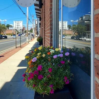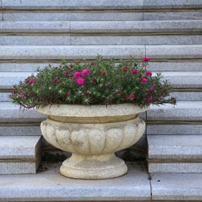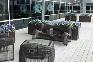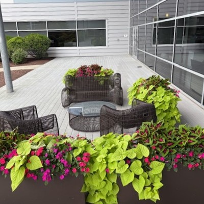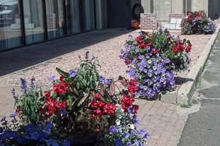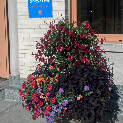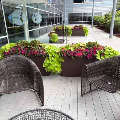 Red, white and blue cool down the sidewalk area where our clients’ employees enter their office building. Summer flowers in this protected spot thrive from June to almost November!