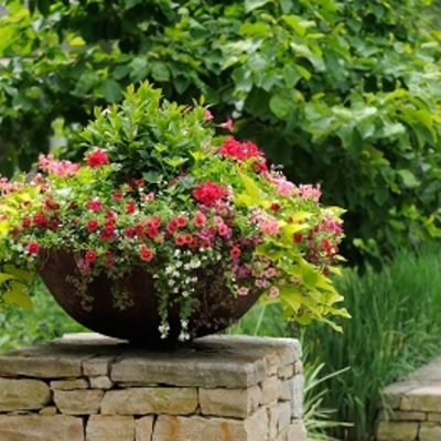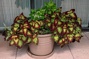 Some spots are in full shade and the subtlety of colored foliage calms and soothes. We use blooming begonias and torenia here also but sometimes it is fun to just let the coleus go wild and even send out its own small flowers.