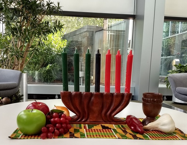 Displays of wooden kinaras with green, red and black candles arranged with African textiles, lifelike fruit and unity cup invite us all to consider community, family and culture.