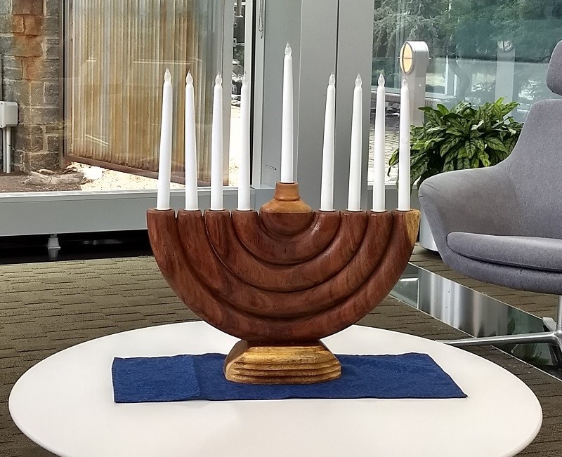 Custom carved menorahs with candles and blue runners add to the sacredness of the holiday season.